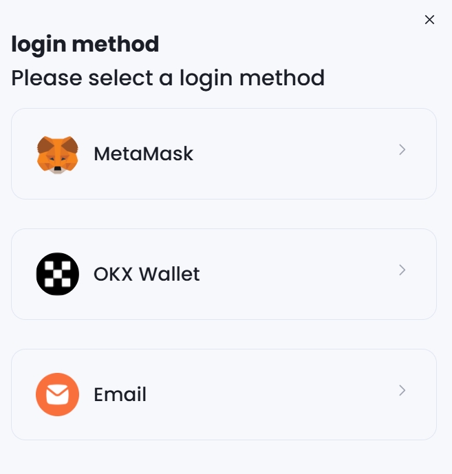 You can directly choose to register with an email address, which is convenient and fast. Of course, we also integrate and are compatible with mainstream wallets such as OKX, MetaMask (Little Fox Wallet) for direct login.